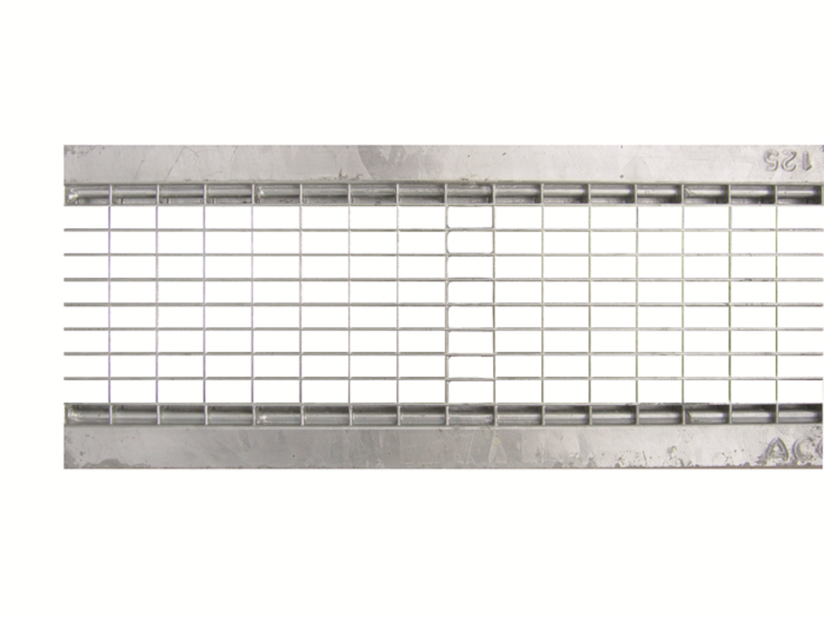 Grelha entramada 30x15 em aço galvanizado, de classe de carga B125 de acordo com a norma EN1433, para canais de drenagem ACO N/SELF N150/SELF200. Com sistema de fixação por Springlock®. Área de absorção de 1201 cm²/m. Comprimento total de 1000 mm e largur